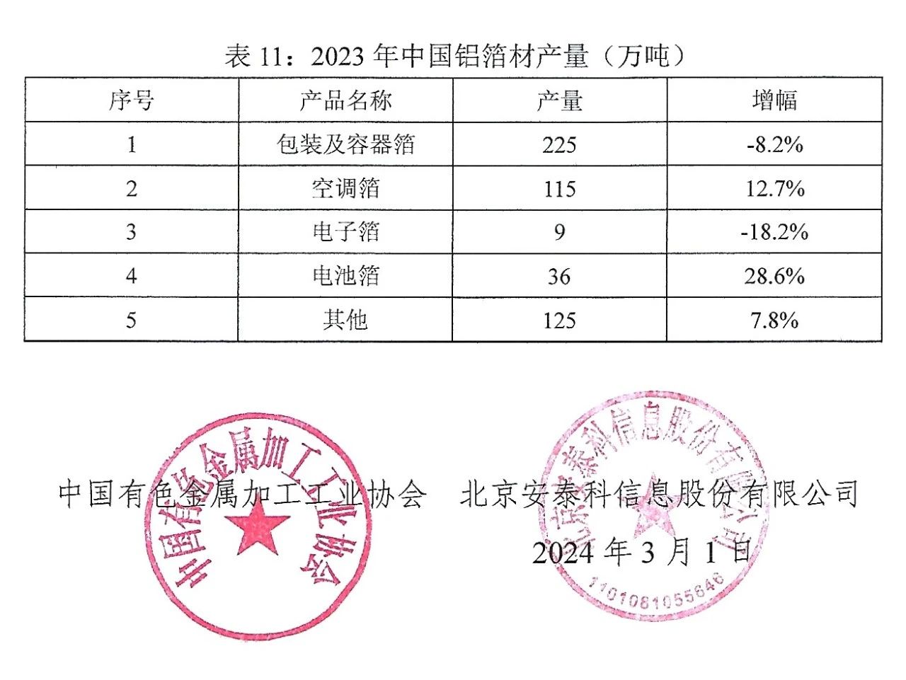 2023年,中國銅加工材綜合產(chǎn)量為2085萬噸,比上年增長3.0%。鋁加工材綜合產(chǎn)量為4695萬噸,比上年增長3.9%,其中剔除鋁箔坯料后的鋁加工材產(chǎn)量為4115萬噸,比上年增長4.2%。銅鋁加工材細分品種產(chǎn)量和鋁擠壓材表面處理方式構成詳見下表1至表11。